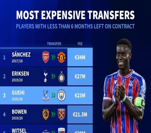 北京时间1月20日,在曼城官宣了格伊的交易之后,德转列出了世界足坛历史合同剩余不到半年的球员转会身价榜,2018...